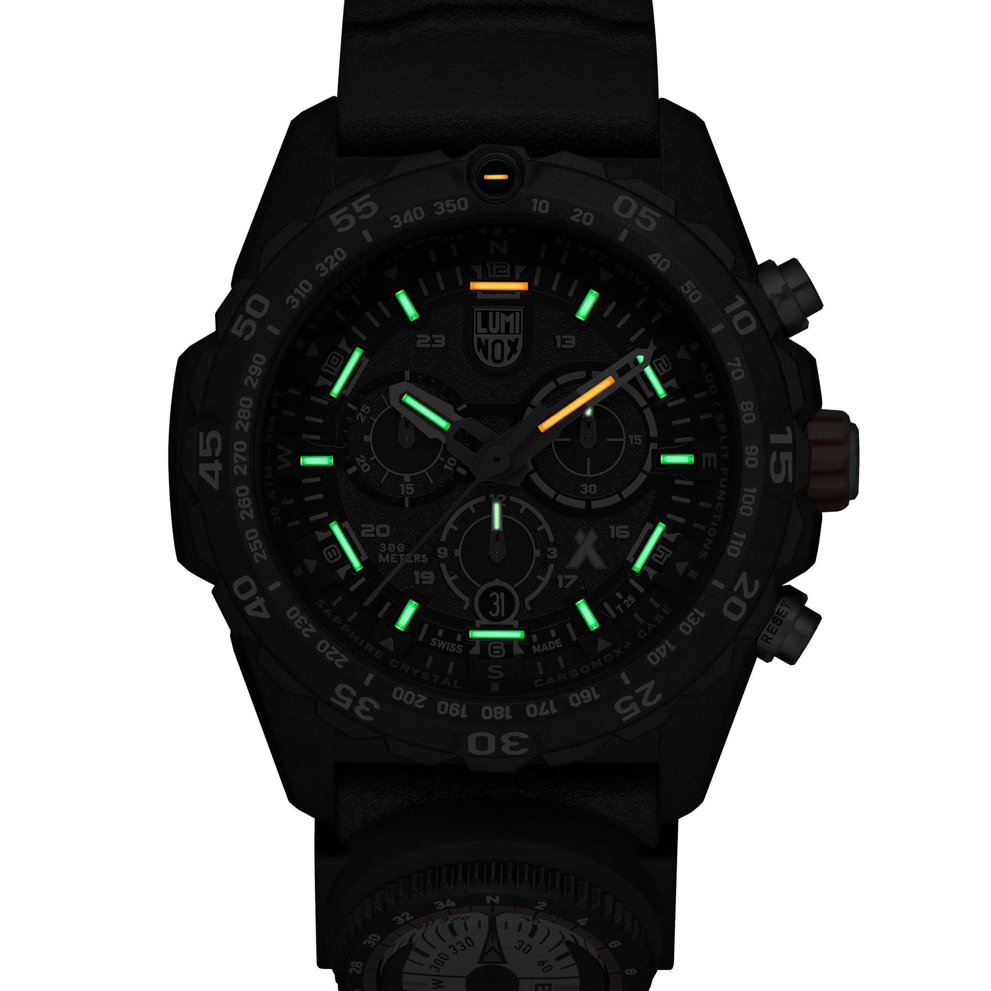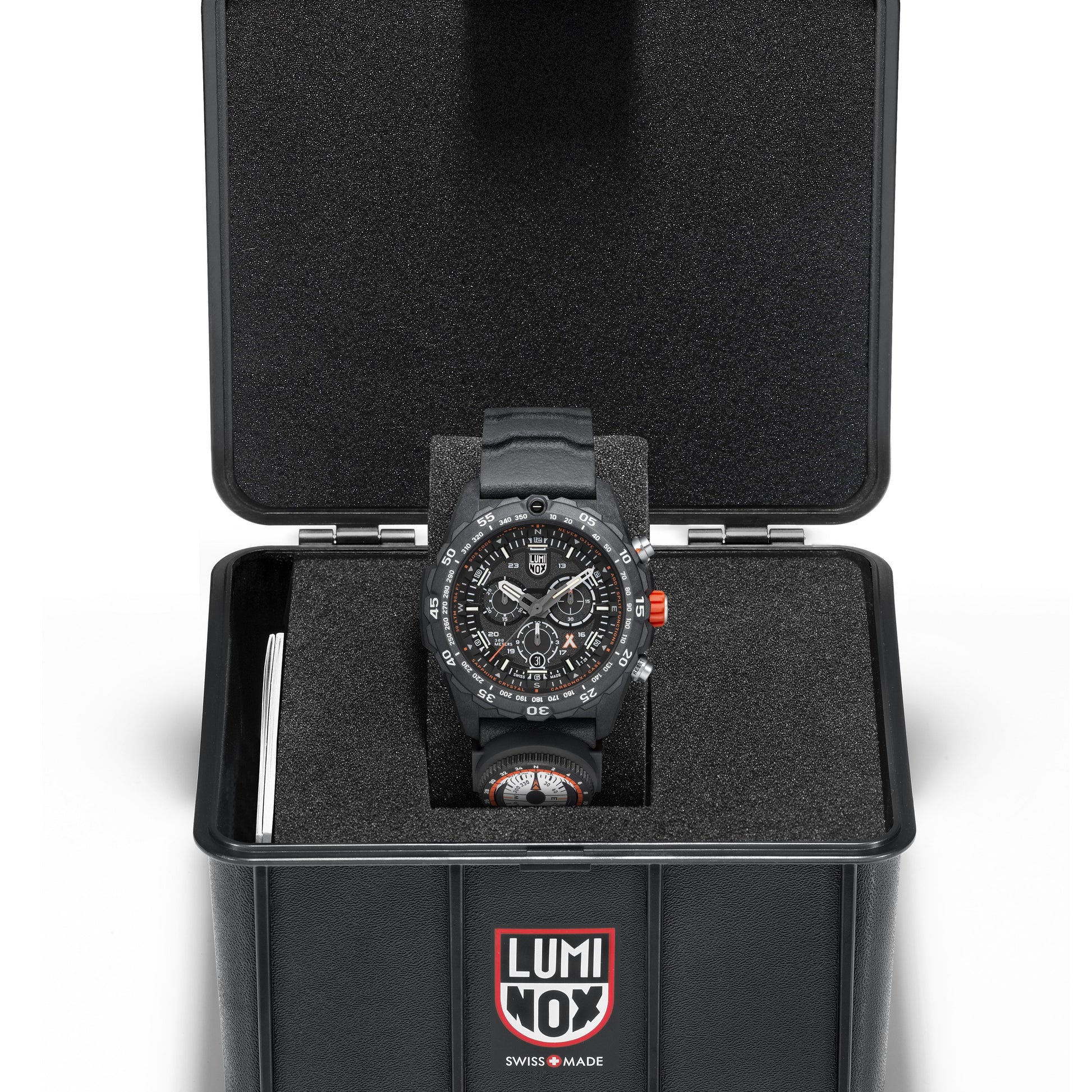 The MASTER series includes two chronographs with 45mm CARBONOX+™ cases with orange details on the case, including SOS in Morse code for quick locating. The chronograph push buttons are solid stainless steel and the stainless steel crown features an orange rubber ring for a good grip. This exceptional watch is water-resistant to 300 meters and features a sapphire crystal with an anti-reflective coating. It comes with a black rubber strap and is equipped with a compass already attached to the strap.
