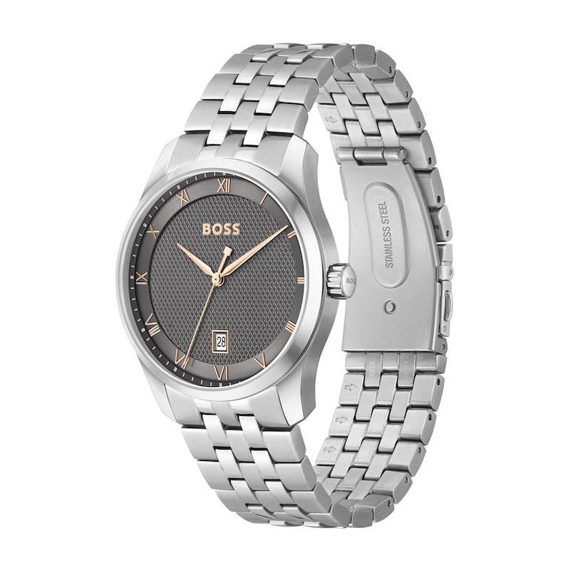 Large Roman numerals contrast with a modern textured dial in the refined BOSS Principle. This three-hand timepiece with date function features domed mineral glass over the watch face for a classic feel, while a stamped pattern at the center of the dial is balanced by a circular brushed outer ring. Designed with a stainless-steel case, the Principle is fitted with a choice of five-link bracelet, mesh bracelet, or crocodile-textured leather strap, to complement a variety of looks.