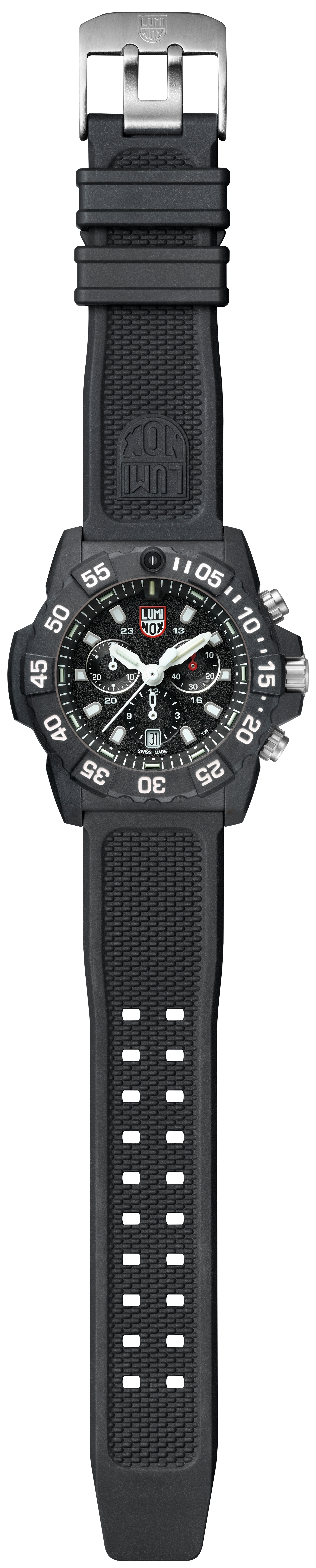 The Luminox Navy SEAL Chronograph impresses with its 45 mm CARBONOX™ case, diver's bezel and water resistance of up to 200 meters and can be used for diving. Best readability during the day thanks to white lettering on a black background. At night thanks to the proven Luminox Light Technology lighting system. "Always Visible", independent of energy, for up to 25 years.