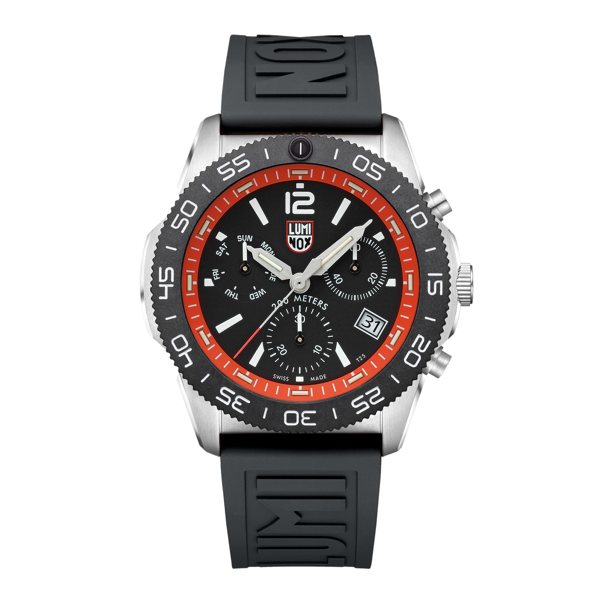 The Pacific Diver Chrono is a nice addition to the chronograph series. A stainless steel case, CARBONOX™ unidirectional rotating bezel, a must-have for every diver and a custom-fit orange and a black rubber strap - for an easy and perfect fit.
