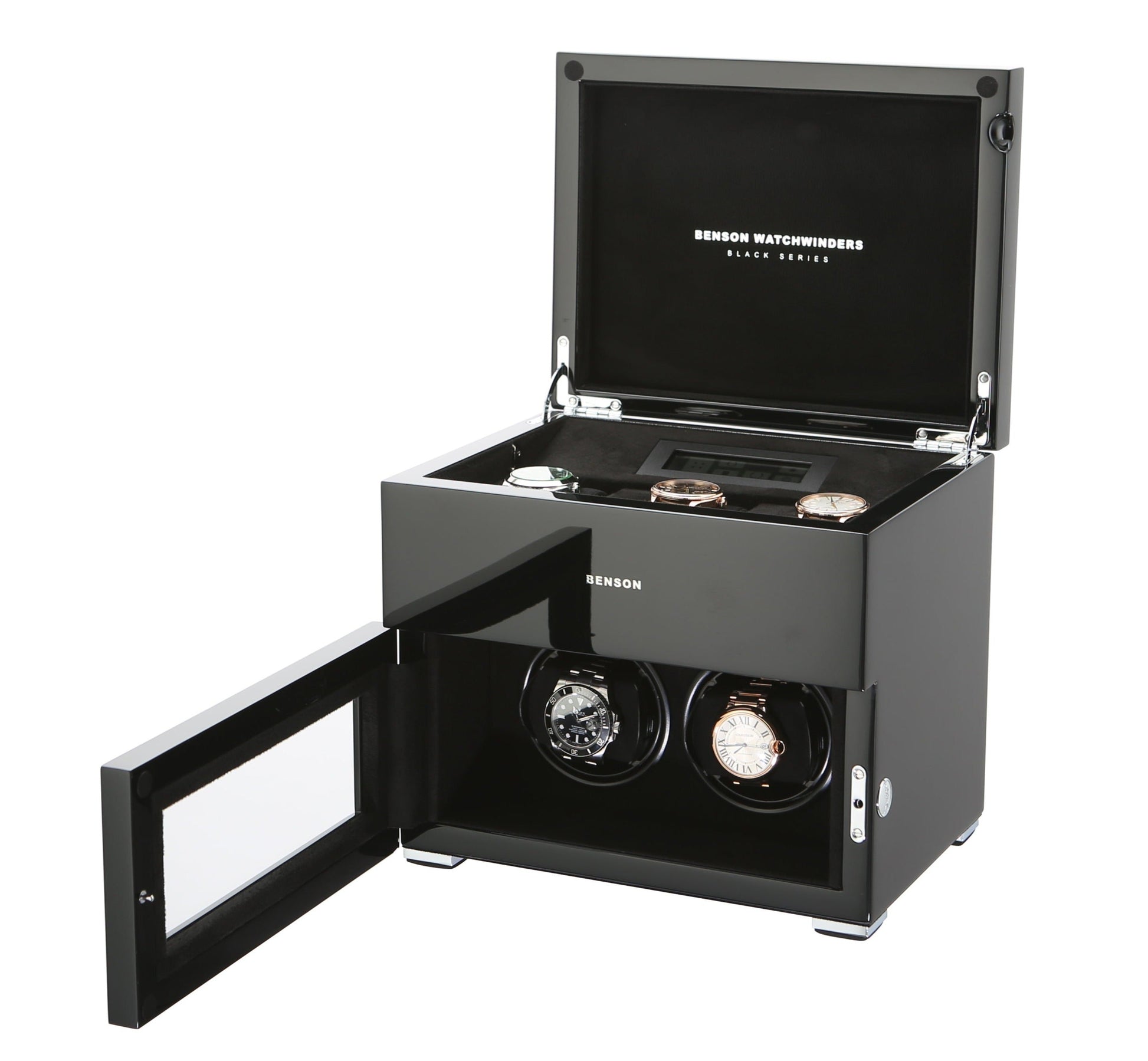The new Benson Black Series represents the most luxurious line of watch winders Benson offers. This product combines the newest in watch winder technology with a stylish design and the highest quality finish. With extra storage for other watches, LED lighting, a soft-close cover, and an innovative touch screen, the Black Series offers both functionality and a quality design. Benson’s lacquered finish ensures a beautiful, rich color no matter which watch winder catches your fancy.