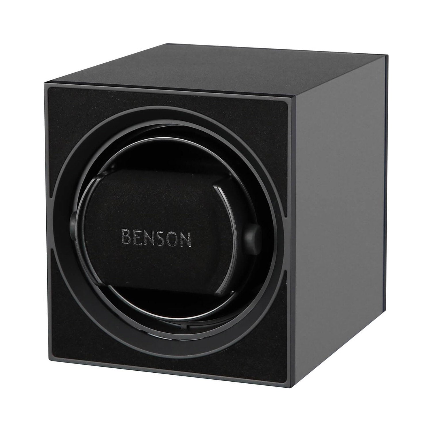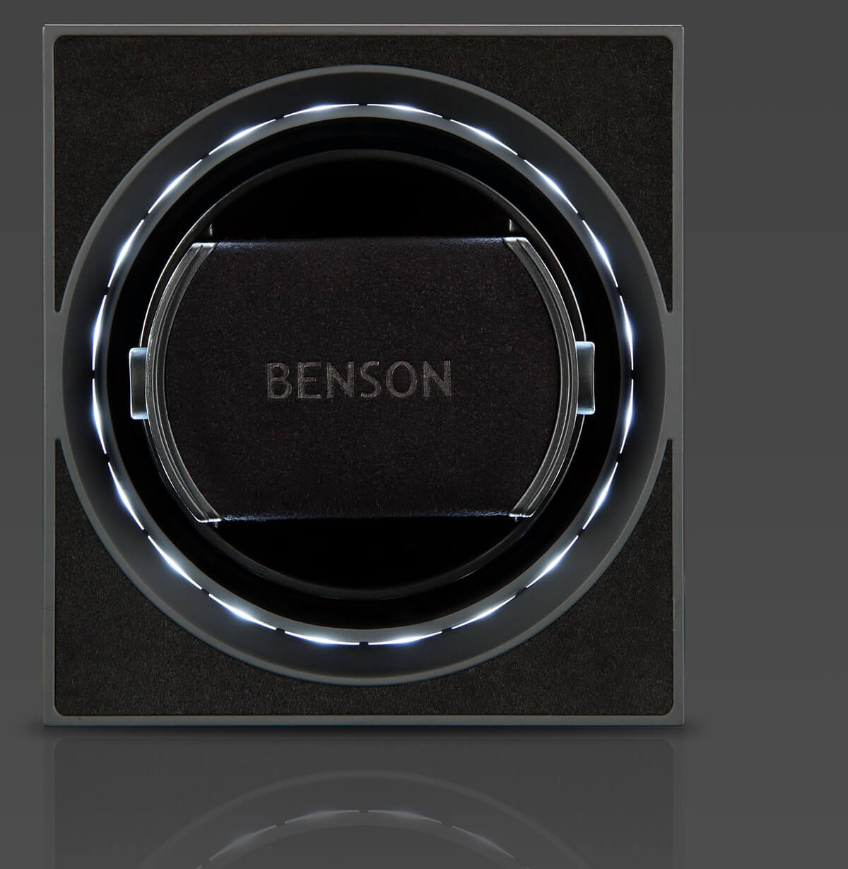 Benson proudly presents its latest generation of Compact Aluminum watch winders. This new series of watch winders has a modern design, is compact and contains excellent features. These new Benson Compact Aluminum watch winders provide any automatic watch, regardless of brand or model, with sufficient energy completely safely and easily so that the watch is immediately ready to wear. The advantages of the Benson Compact Aluminum watch winders are the excellent price/quality ratio, high functionality and beautiful finish. Each model can be fully configured in terms of direction of rotation and number of revolutions per day. In addition, an important advantage is that this Benson Compact Aluminum 1 Black watch winder functions for +- 6-9 months on one set of batteries. The flexible watch holder ensures that large but also smaller watches click into place in the watch winder for optimal safety of the watch. The special LED lighting ensures that you can also see