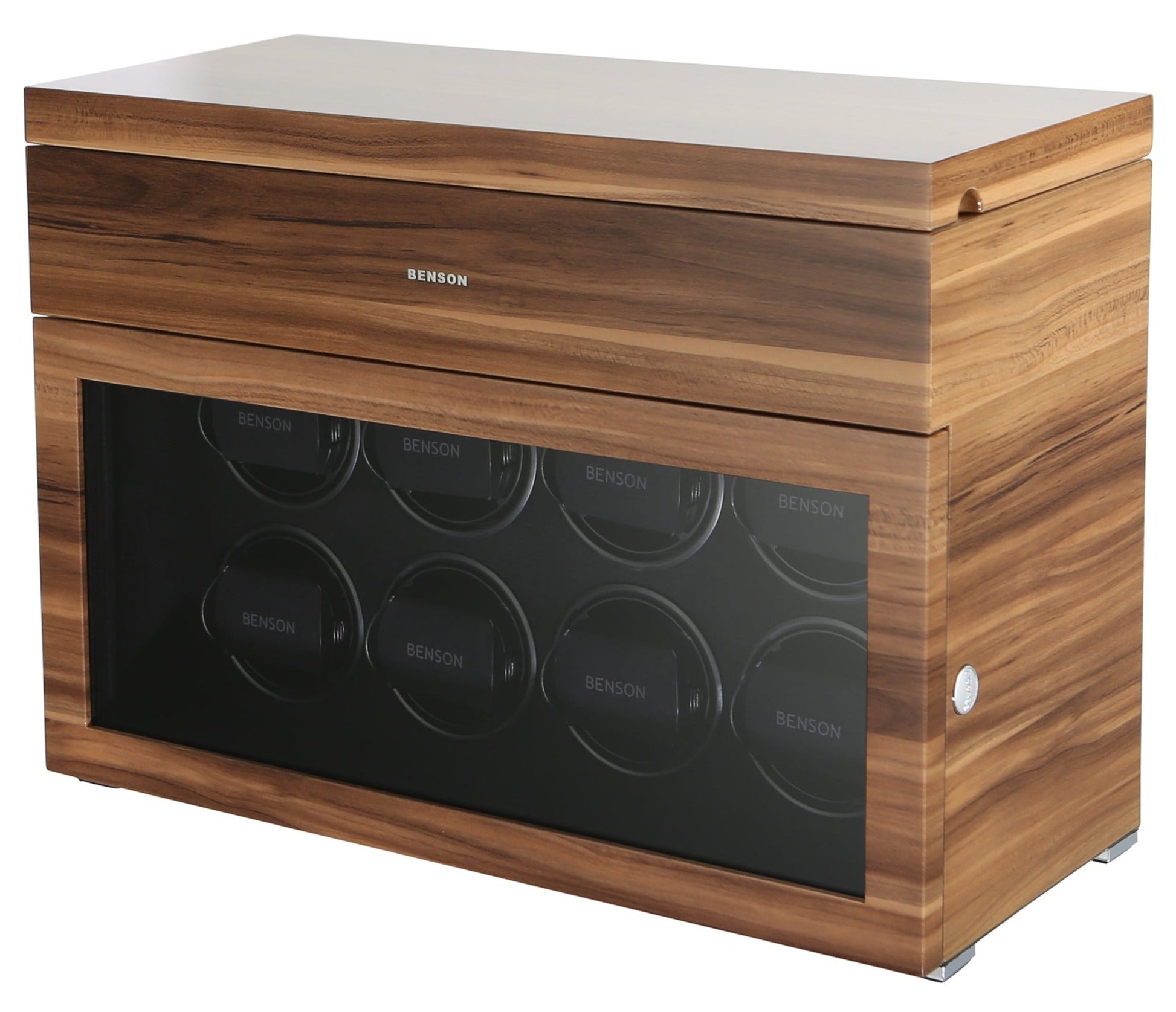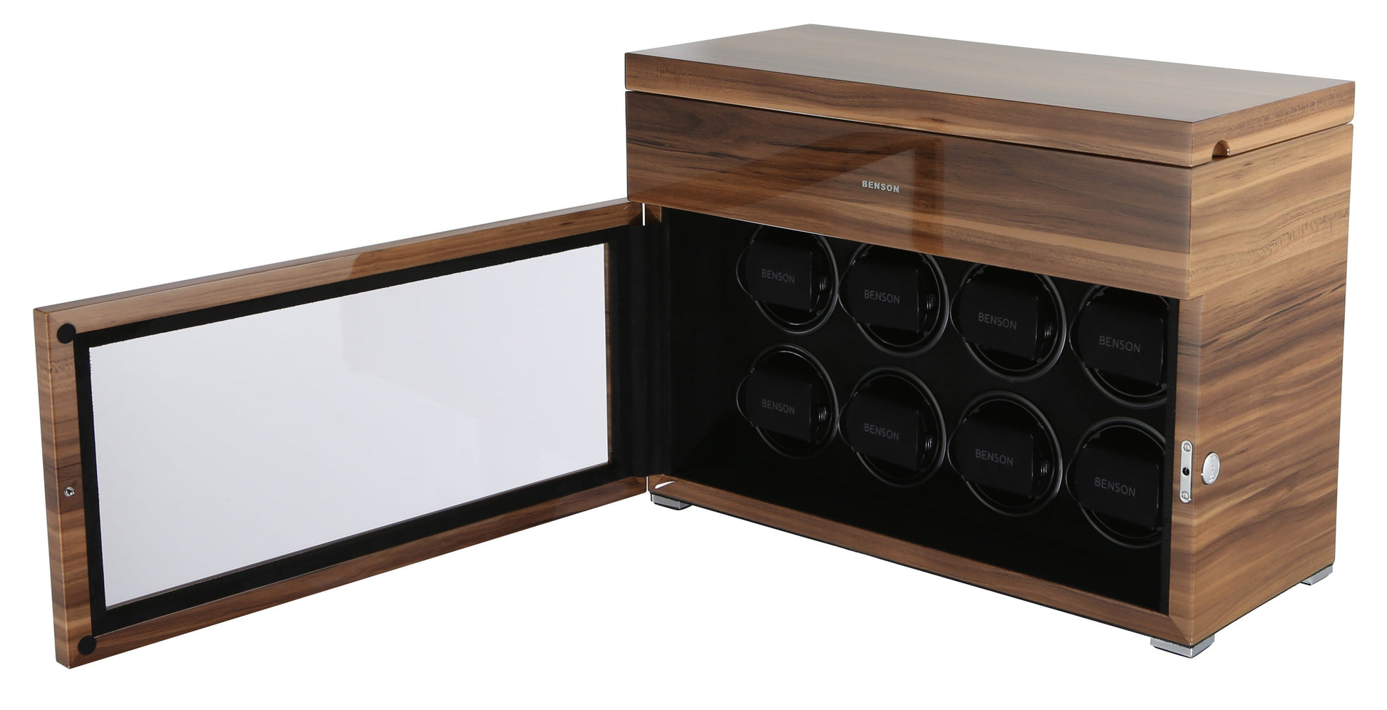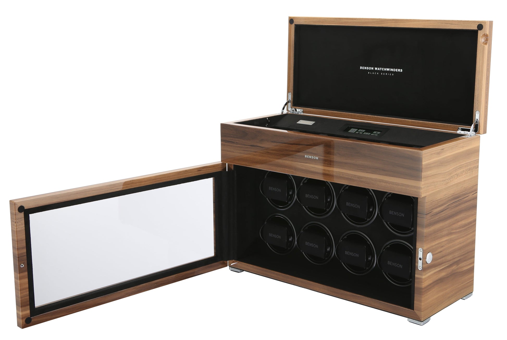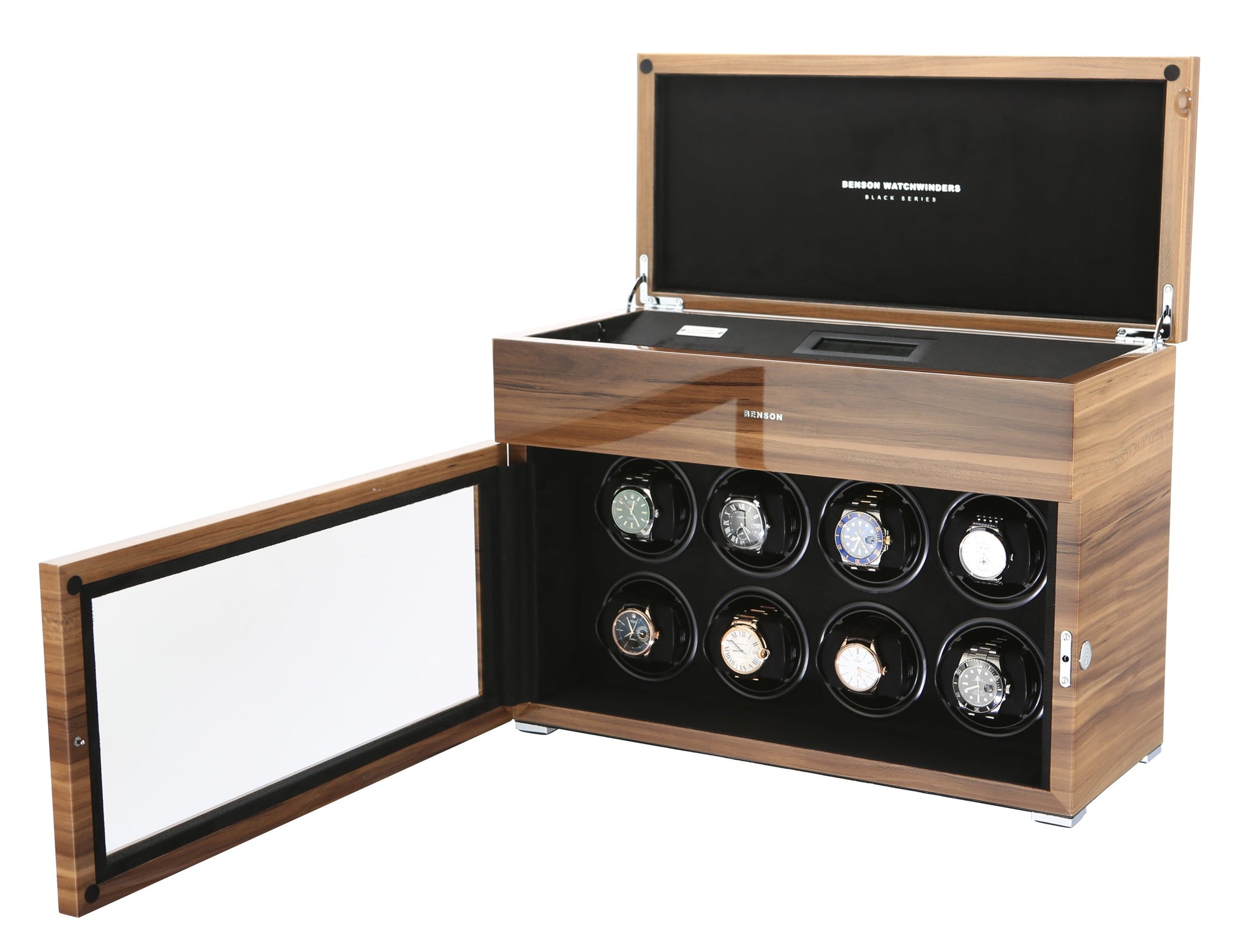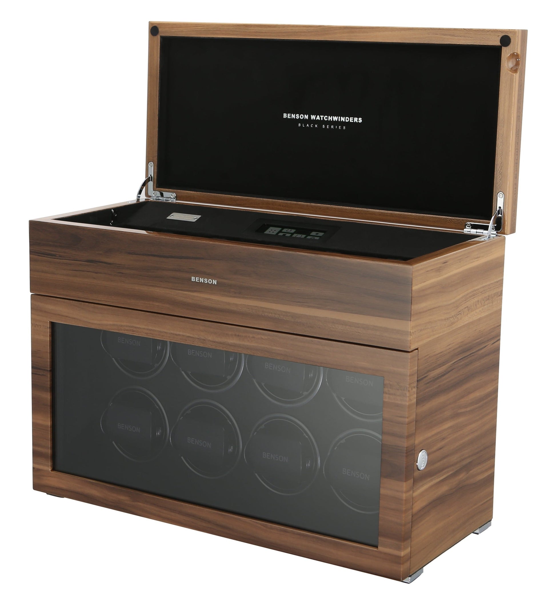 The new Benson Black Series represents the most luxurious line of watch winders Benson offers. This product combines the newest in watch winder technology with a stylish design and the highest quality finish. With extra storage for other watches, LED lighting, a soft-close cover, and an innovative touch screen, the Black Series offers both functionality and a quality design. Benson’s lacquered finish ensures a beautiful, rich color no matter which watch winder catches your fancy.