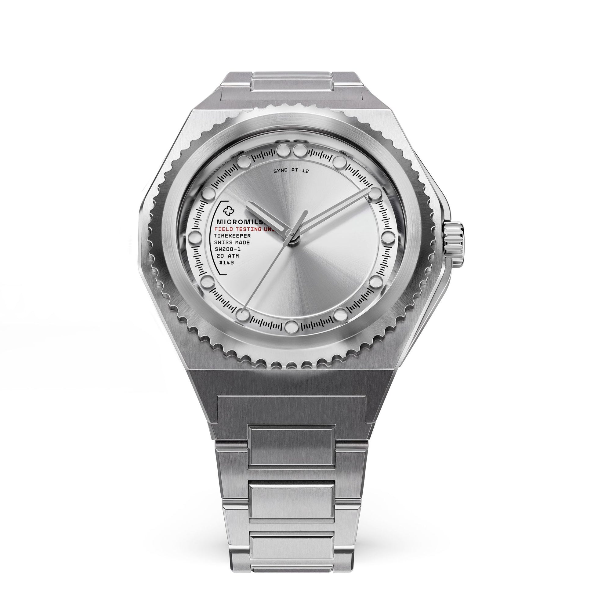 The unmarked unidirectional bezel, crown, and caseback contribute to the unique look and field of the Field Testing Unit. Executed in a brushed stainless steel case, integrated straps, chamfered crown guard, screw in crown and sapphire crystal.