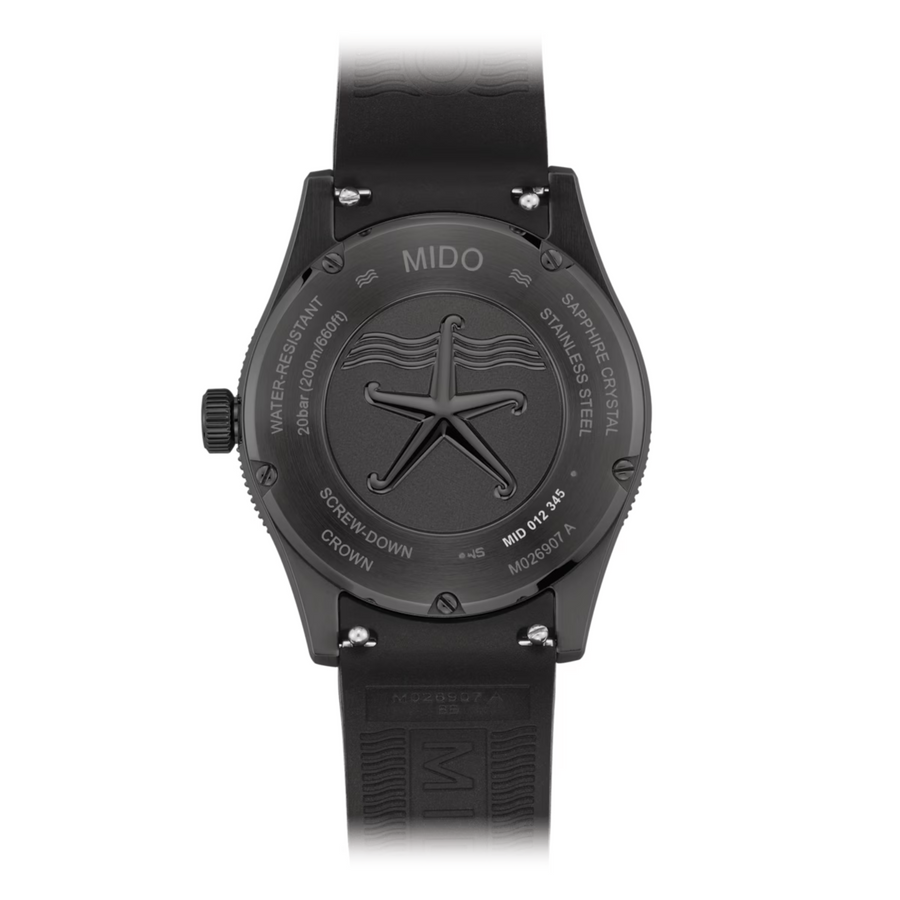 Get set for an adventure – on land or across the ocean, but always in great style! MIDO proposes what is undeniably its most versatile Ocean Star watch model, a sporty, reliable and chic companion for any escape. Its perfect 39 mm diameter, is combined with a beautifully slim case for the Ocean Star. The aesthetic of this automatic watch is defined as well by its unique and distinctive relief dial – evoking the movement of the currents across the sand. Water-resistant up to a pressure of 200 m (20 bars / 660 ft), the famous starfish motif - emblem of MIDO's historic watchmaking expertise in water-resistance - is featured on its screw-down case back.